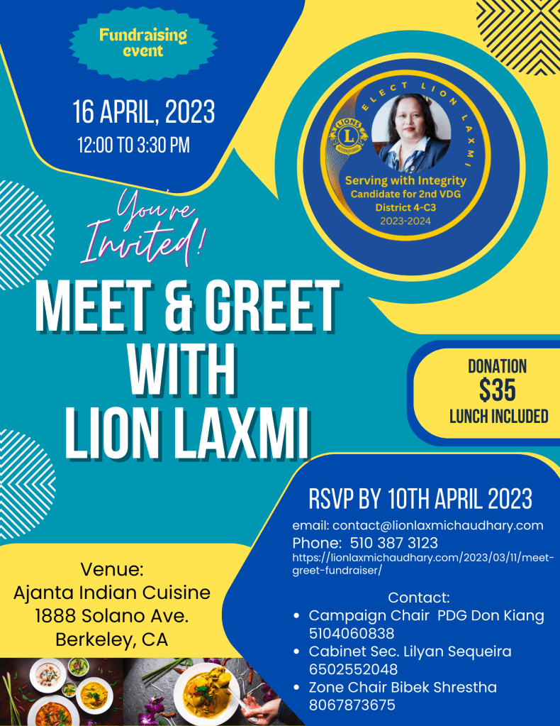 Berkeley, CA – Lion Laxmi Chaudhary, the Vice District Governor candidate, is organizing a fundraising event to support her campaign. The event is scheduled for March 16th, 2023, from 12:00 to 4:00 pm at Ajanta Distinctive Indian Cuisine on 1888 Solano Ave. in Berkeley.